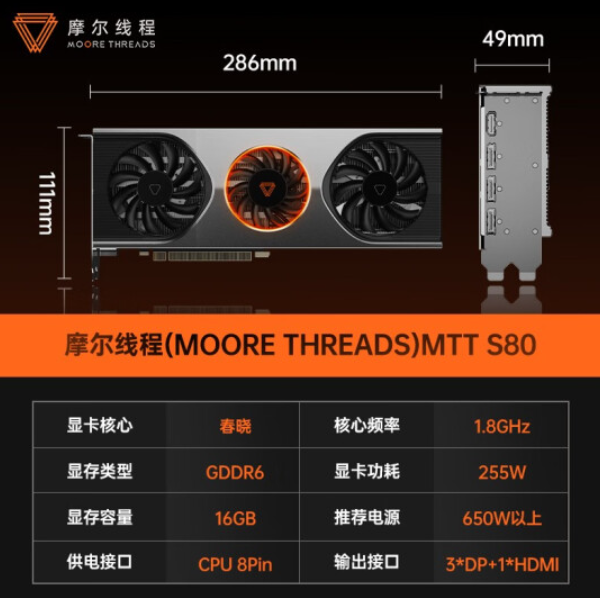 摩爾線程 MTT S80 國產(chǎn)顯卡于去年 11 月發(fā)布,今日 10 點再次開售,定價 2999 元。