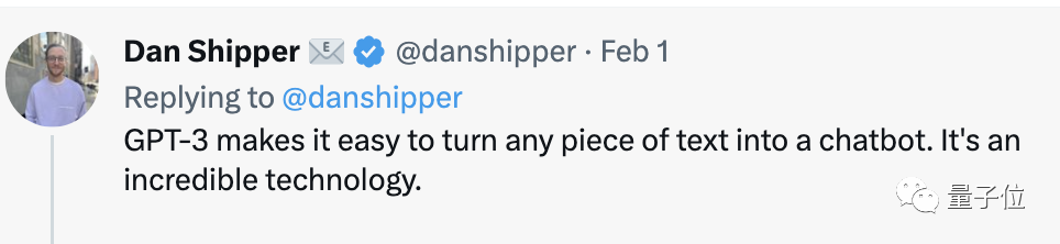 開發(fā)者 Dan Shippers 稱,做出這個(gè) AI 并不難,主要功臣就是語言大模型 GPT-3,另外再加幾行代碼就搞定了。