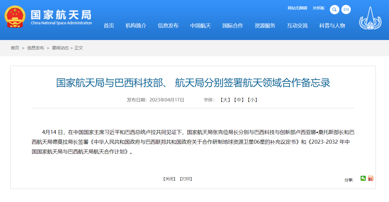 國家航天局今日宣布,張克儉局長于 4 月 14 日分別與巴西科技與創新部盧西亞娜?桑托斯部長和巴西航天局德莫拉局長簽署《中華人民共和國政府與巴西聯邦共和國政府關于合作研制地球資源衛星 06 星的補充議定書》和《2023-2032 年中國國家航天局與巴西航天局航天合作計劃》。