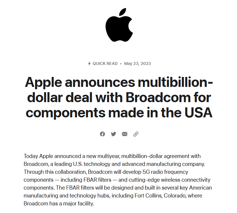 5月23日,蘋果宣布與博通公司(蘋果長期供應商合作伙伴之一)建立新的重要合作伙伴關系。蘋果公司稱這是一項“數十億美元的交易”,博通將在美國開發和生產一些關鍵的5G射頻組件。