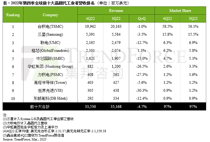 根據TrendForce報告顯示,2022年第四季前十大晶圓代工產值經歷十四個季度以來首度衰退,環比減少4.7%,約335.3億美元,且面對傳統淡季及大環境的不確定性,預期2023年第一季跌幅更深。
