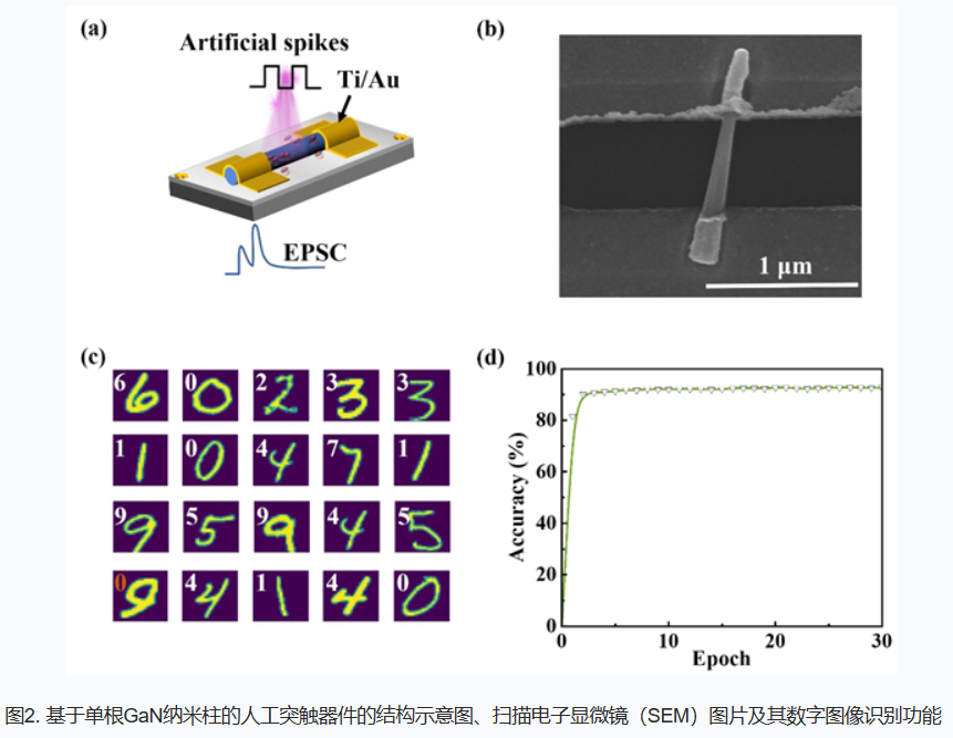 在上述納米柱陣列的基礎(chǔ)上,該團(tuán)隊(duì)提取了單根GaN納米柱,實(shí)現(xiàn)了人工突觸器件的制備,并與器件電導(dǎo)性能相結(jié)合,構(gòu)建神經(jīng)網(wǎng)絡(luò)模擬對(duì)數(shù)字圖像的識(shí)別,識(shí)別準(zhǔn)確率可在30個(gè)訓(xùn)練周期后高達(dá) 93%(圖2)。由于單根GaN納米柱的體積極小,單次脈沖能耗可低至 2.72×10-12 J,這有助于研發(fā)低功耗的神經(jīng)網(wǎng)絡(luò)計(jì)算系統(tǒng)。相關(guān)研究成果以Light-stimulated low-power artificial synapse based on a single GaN nanowire for neuromorphic computing為題發(fā)表于Photonics Research,共同第一作者是中國(guó)科學(xué)院蘇州納米所博士生周敏和副研究員趙宇坤。