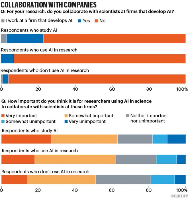 調查中出現的另一個主題是商業公司主導了 AI 的計算資源和 AI 工具的所有權。研究 AI 的科學家中有 23% 表示他們與開發這些工具的公司合作或在這些公司工作(其中最常提到的是谷歌和微軟),而使用 AI 的人中只有 7% 這樣做。總體而言,略多于一半的受訪者認為,使用 AI 的研究人員與這些公司的科學家合作是非常重要或有些重要的。