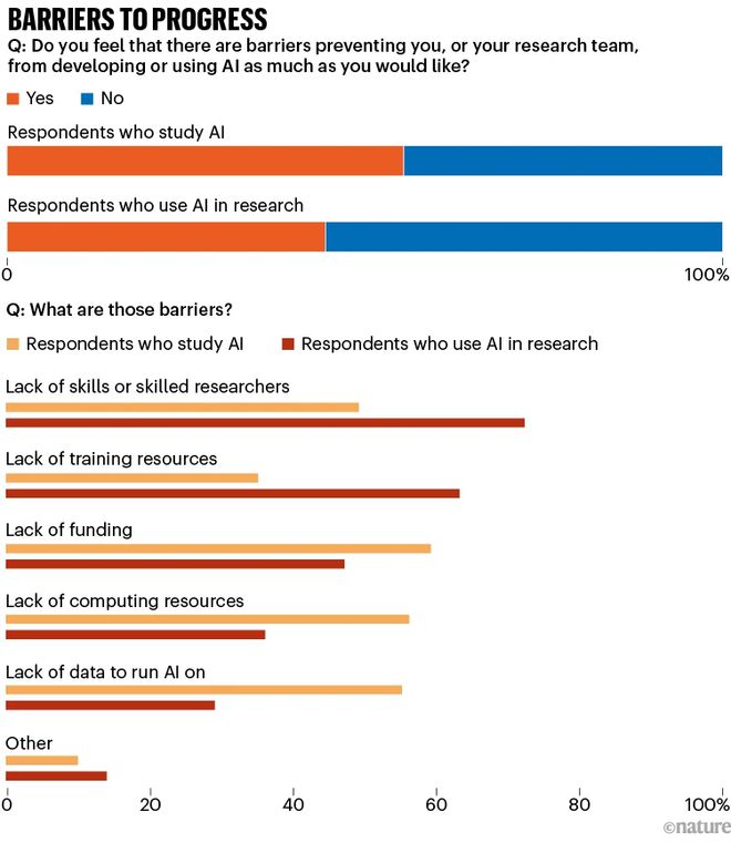 在這項調查中,大約一半的科學家表示他們在開發或使用 AI 方面遇到了阻礙。直接研究 AI 的研究人員最擔心的問題包括計算資源不足、為其工作提供的融資不足以及獲取運行 AI 所需的高質量數據不足。而那些在其他領域工作但在研究中使用 AI 的人則更擔心缺乏熟練的科學家和訓練資源,此外,他們還提到了安全和隱私方面的考慮。然而,不使用 AI 的研究人員表示他們不需要 AI 或認為它不實用,或者缺乏研究 AI 的經驗和時間。