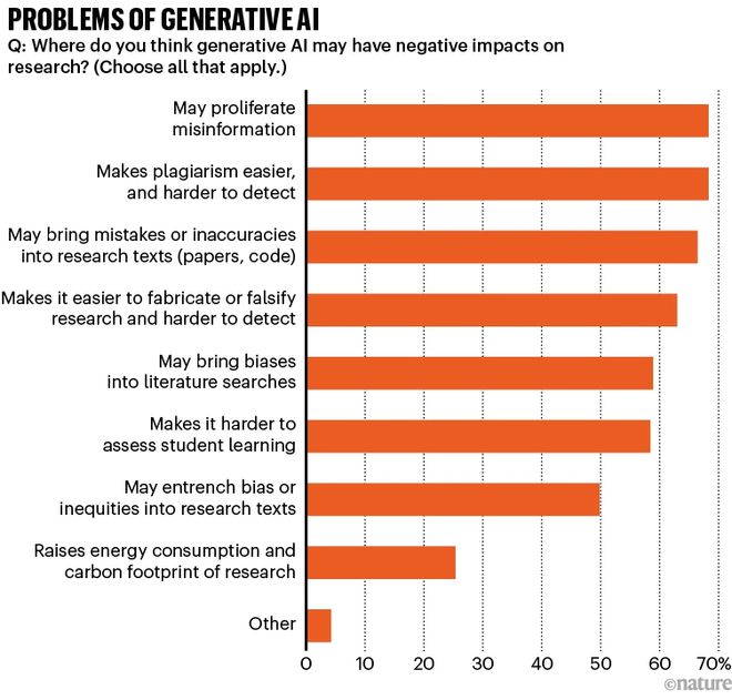 當被要求從可能的生成式 AI 負面影響列表中選擇時,68% 的研究人員擔心信息傳播不準確,另有 68% 的人認為這將使抄襲更容易,檢測更難,66% 的人擔心會引入錯誤或不準確的內容到研究論文中。
