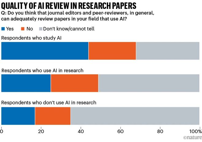 當問及期刊編輯和同行評審人是否能夠充分審查使用 AI 的論文時,受訪者意見不一。在那些使用 AI 進行工作但不直接開發 AI 的科學家中,大約一半表示不知道, 1/4 認為審查是充分的,1/4 認為不充分。直接開發 AI 的人傾向于對編輯和審查過程持更積極的看法。