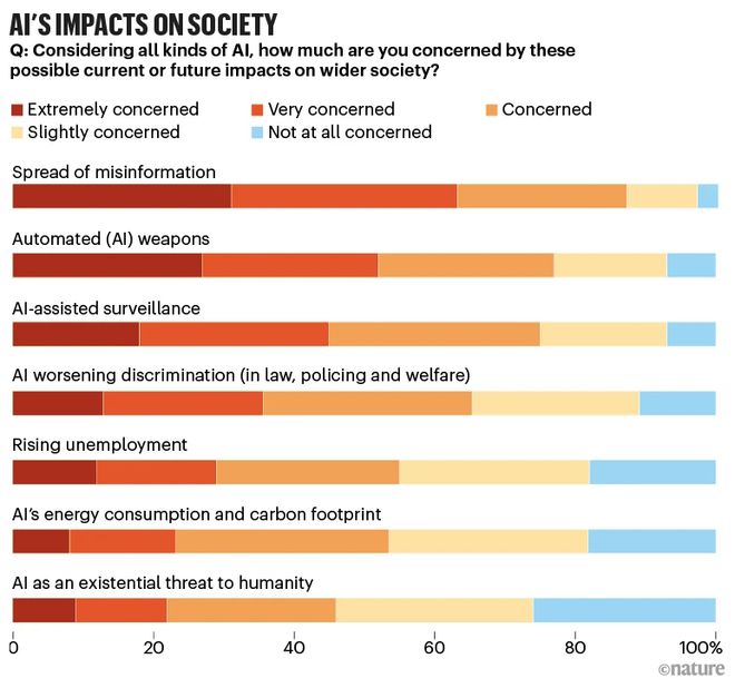 另外,《自然》還詢問了受訪者對于 AI 在社會的 7 種潛在影響的擔憂程度,2/3 的人表示他們對此非常擔憂或很擔憂。自動化 AI 武器和 AI 輔助監視也高居榜首,最不令人擔憂的是 AI 可能對人類構成生存威脅的想法。