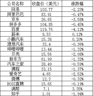 中概電商龍頭股中,阿里巴巴下跌0.47%,京東下跌3.58%,拼多多下跌0.45%。