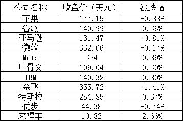 大型科技股多數下跌,奈飛跌幅超過1%;谷歌和Meta上漲,漲幅均不到1%。