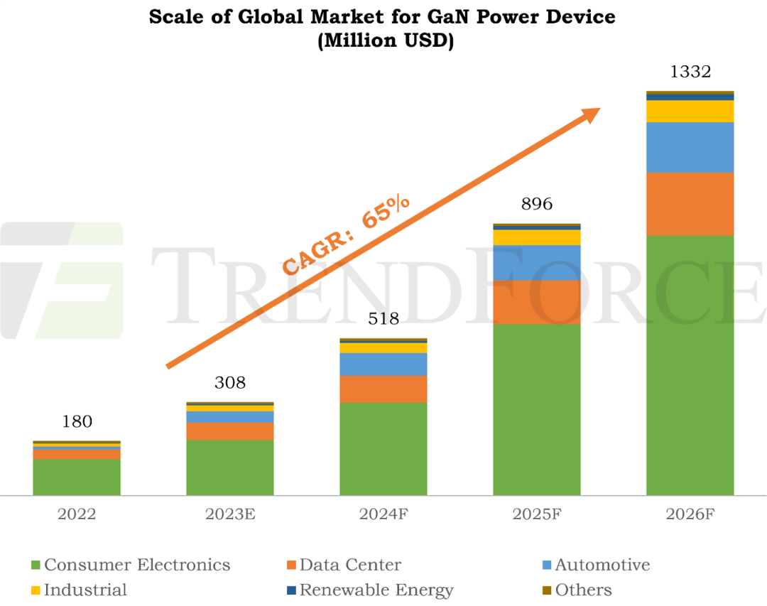 據(jù)市場研究機(jī)構(gòu)TrendForce集邦咨詢顯示,到2026年,全球GaN功率元件市場規(guī)模將從2022年的1.8億美金成長到13.3億美金,復(fù)合增長率高達(dá)65%。