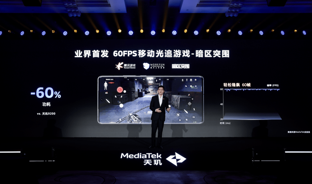 得益于領跑級的光追性能,天璣9300在業界首發支持《暗區突圍》60FPS光線追蹤,不僅輕松穩定60幀且十分穩定,功耗也顯著降低60%,能為用戶帶來更加逼真的超流暢移動光追體驗。
