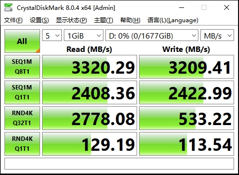 同樣在AS SSD BenchMark中,這款產品同樣非常給力,盡管這款軟件的數據表現較為飄忽不定,但是分數相對于而言較有比對參考意義,超過8000分的成績對于目前的高要求的游戲玩家和設計生產領域已經可以完全滿足要求。